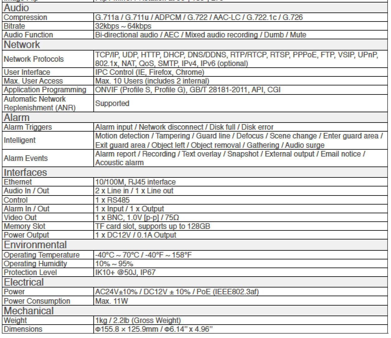 2.0M, 1/3", H.265 / H.264, 1920×1080@30fps / D12.8~12mm @ F1.4 motorized varifocal AF lens 20~40M Infrared Distance, IP67, IK101 x RS485, 1 x Alarm in / out, 1 x Video out2 x Audio in, 1 x Audio out1 x Micro SD card slot (Max. 128GB)AC24V / DC12V / PoE, 11W (Power Adapter Not Included).