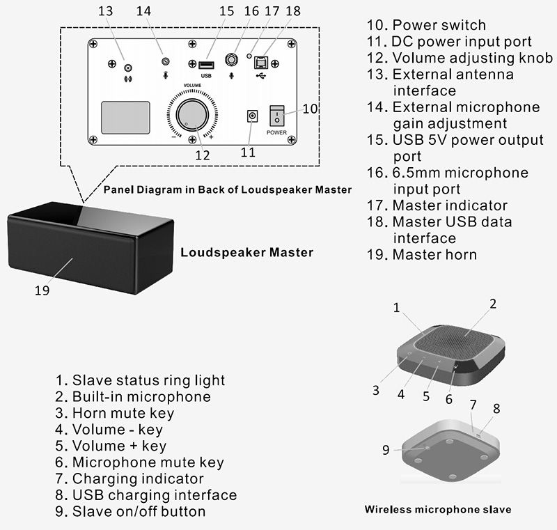 - Connect:The speaker is connected to the computer with a USB data cable; the omnidirectional microphone is connected wirelessly