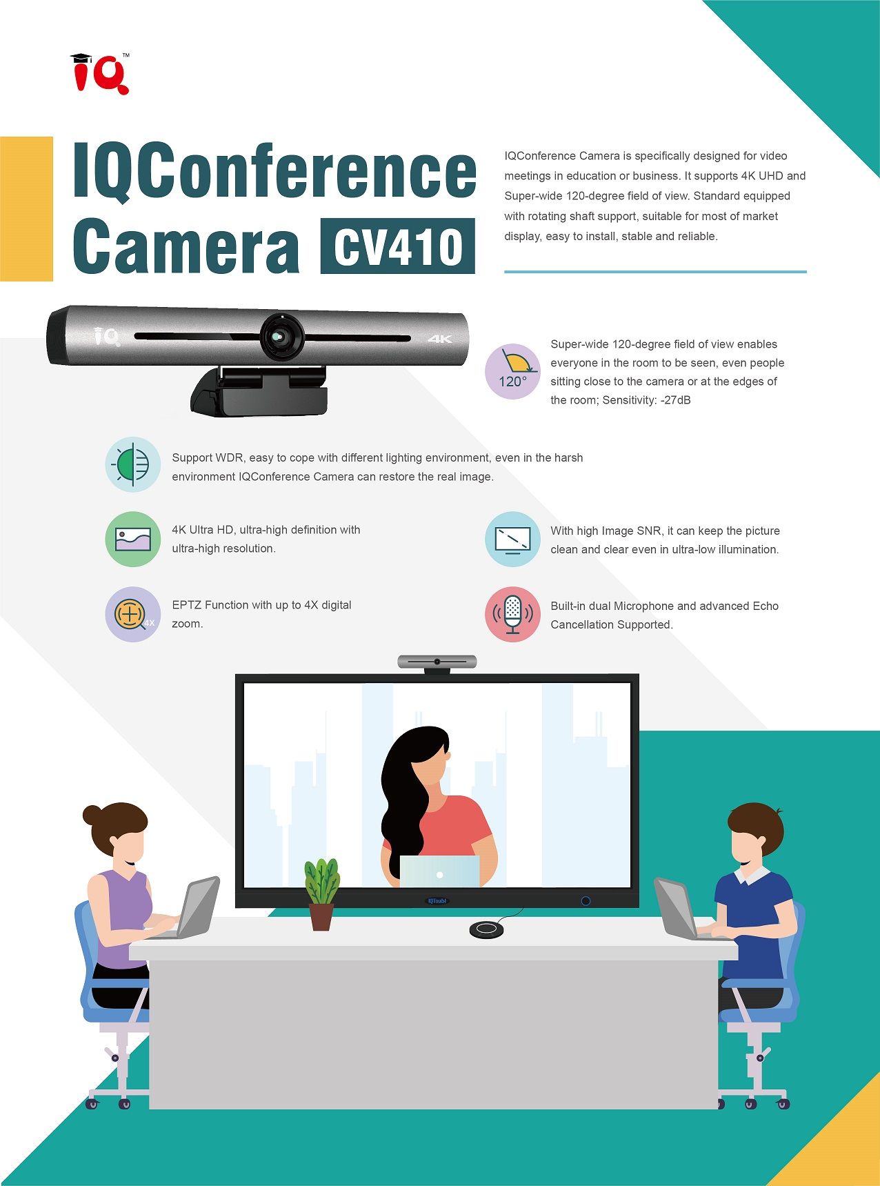 IQConference Camera CV230 offers perfect functions and superior performance. The features include advanced ISP processing algorithms to provide vivid images with a strong sense of depth, high resolution,and fantastic color rendition. Working stably and reliably; easy and convenient to install and maintain.