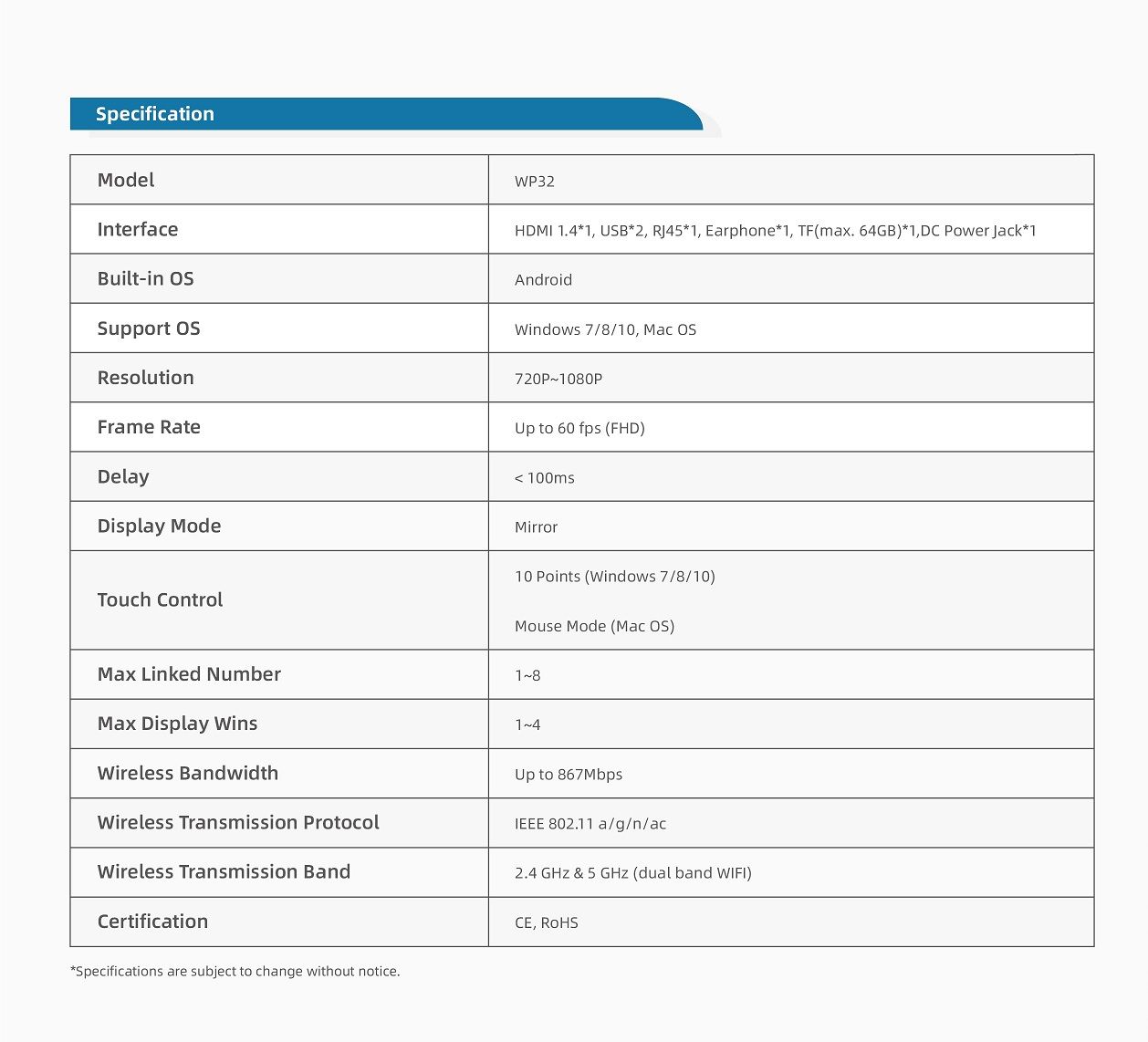 Interface: HDMI 1.4*1, USB*2, RJ45*1, Earphone*1, TF(max 64GB)*1, DC power jack*1