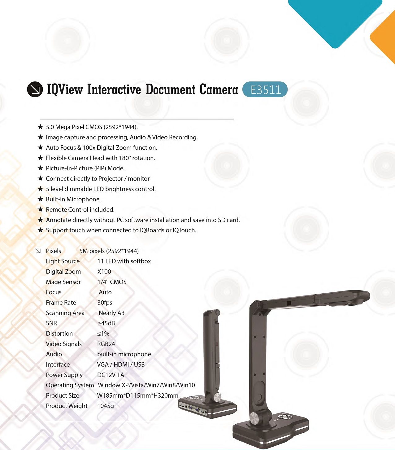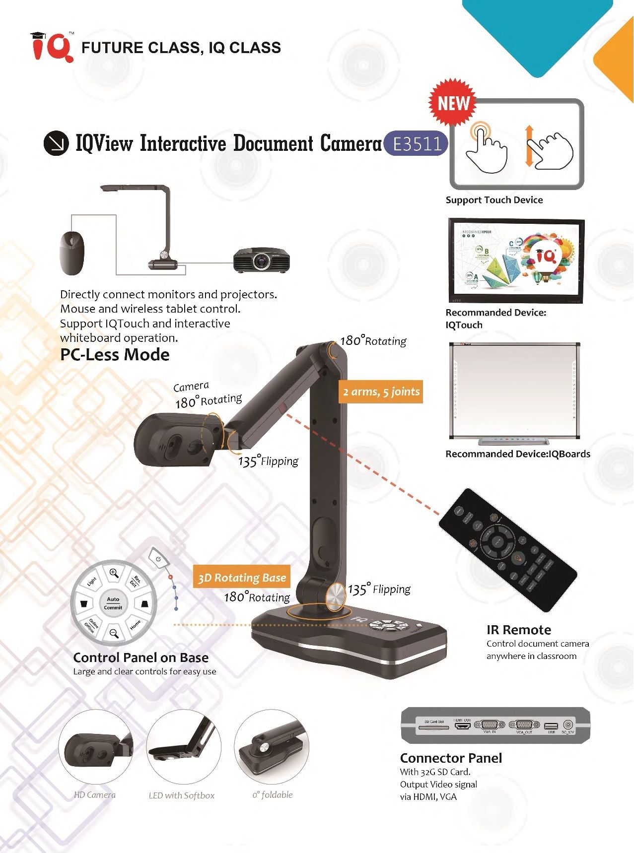 Interactive Document Camera is a completely new concept design and mobile visualizer. The touch capability on IQTouch and IQBoard, IQView E3511 Document Camera can be freely used for presentations anywhere in or out of the classroom or office.