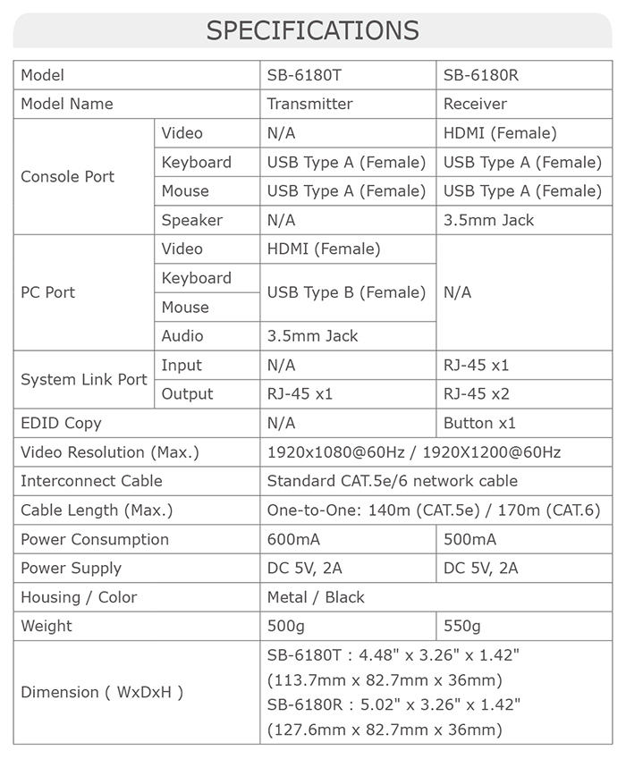 The SB-6180 is a high performance KVM (Keyboard, Video and Mouse) extender that allows a customer to have full console control at 170 meters (1080p resolution) remote. The flexibility of CAT.5e/6 cables makes this easily routable and is an inexpensive method for extending a full KVM console. It can transmits HDMI digital video stream, USB Keyboard/Mouse and stereo audio via one CAT.5e/6 cable. In operation, SLK180H is truly plug and play, capturing full EDID data from the display ensuring your hardware is always setup to deliver optimal display performance. It is optimized for applications at industrial control, security, KVM extension.